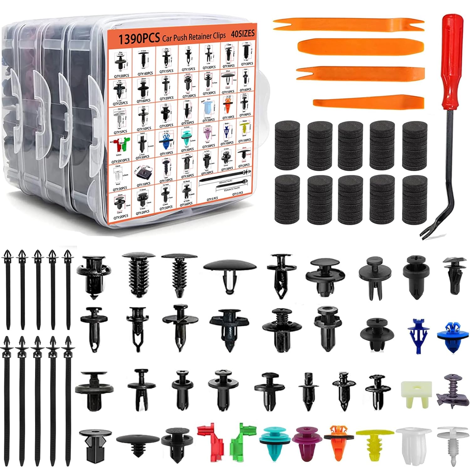40 most popular sizes Car Retainer Clips Kit fit for car trim door panel, bumper, Fender, engine cover and splash shield retainers replacement and 200 pcs Vibration resistant sponge cushion and 1 pcs Fasteners Remover for GM Ford Toyota Honda Chevrolet.