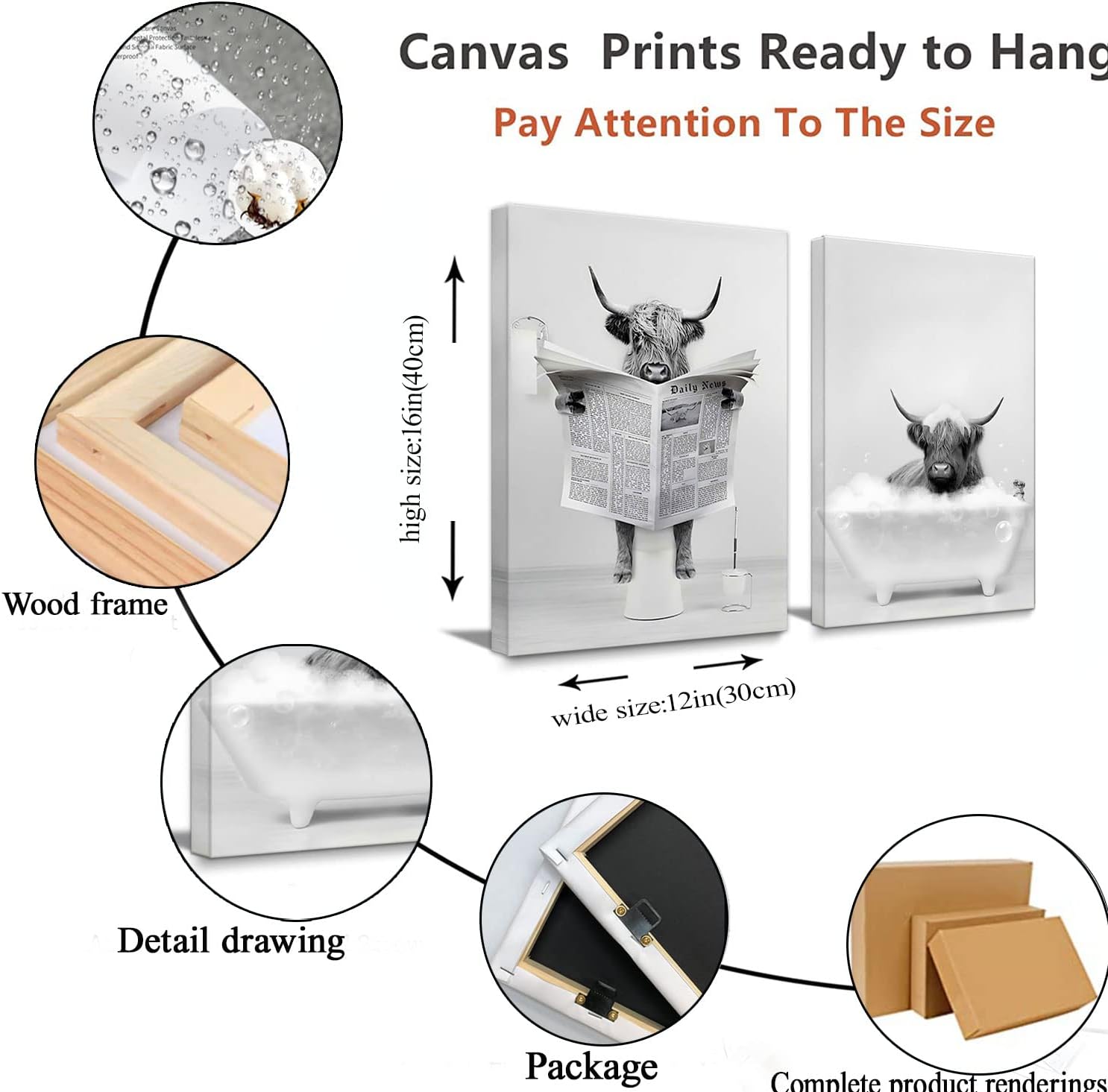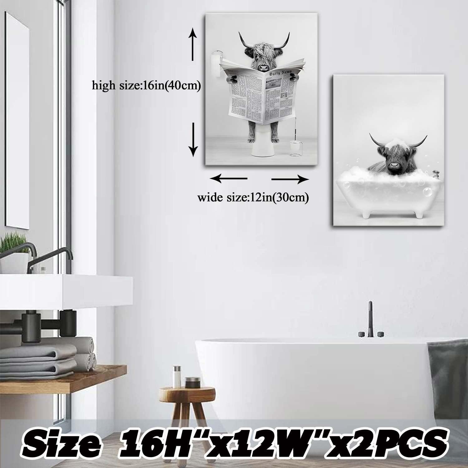 Fun highland cow wall art: Ready to hang The size of the Bathroom cow wall art set is: 12×16 inches (30×40 cm)*2 pieces.