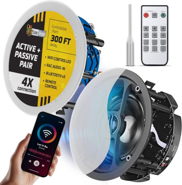 Wireless & Flexible Connectivity Indoor Speakers – Stream music wirelessly with dual connection options: Wi-Fi up to 252ft and Bluetooth 5.0 up to 30ft. Designed for versatility, these in ceiling Bluetooth speakers can be controlled via remote, Wi-Fi app, or RCA cable, giving you complete flexibility for your home speaker system, office audio setup, or surround sound receiver. You can easily integrate these Bluetooth wall speakers without needing professional tools or complex wiring.