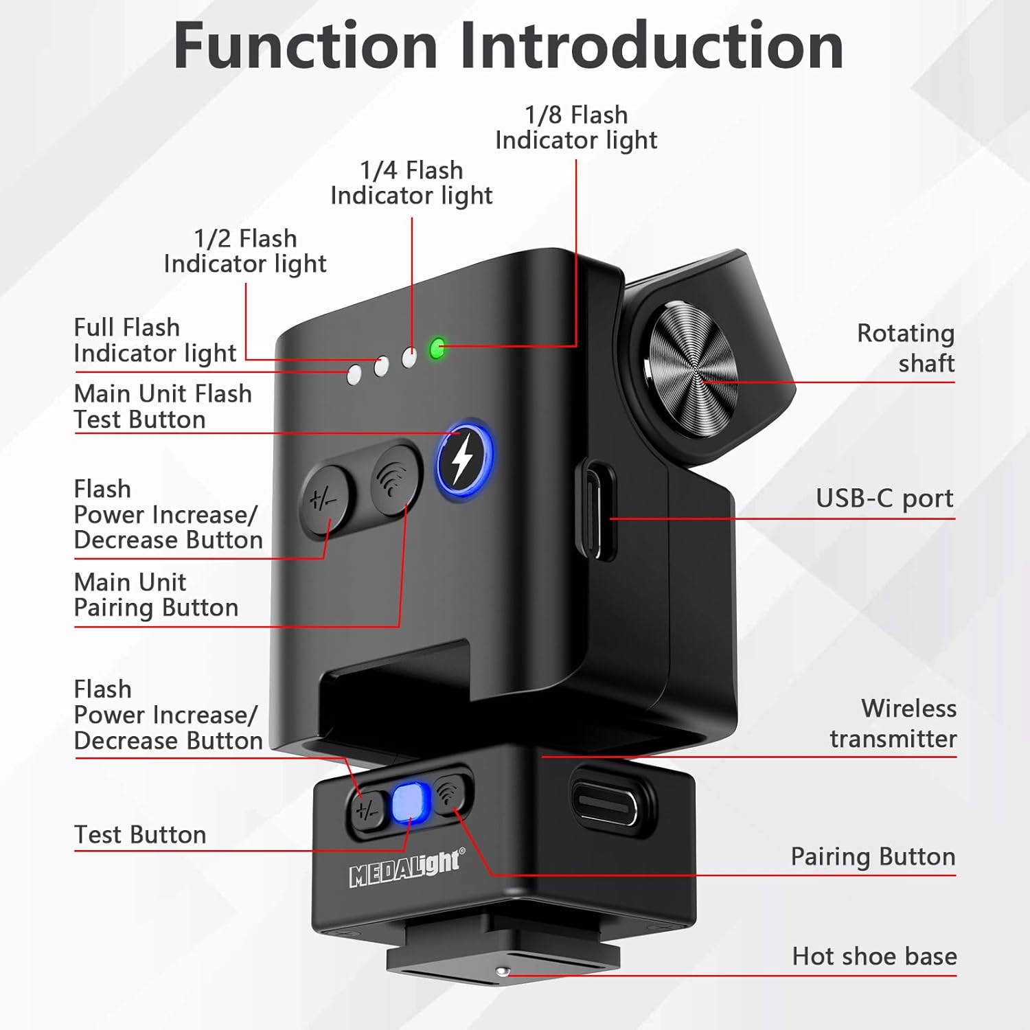 Wireless Off-Camera Flash: The MEDALight F2 mini camera flash comes with a 2.4GHz wireless transmitter, enabling seamless remote control within a range of up to 10 meters(In an accessible environment). It’s an ideal choice for off-camera flash setups. When you plug the transmitter into the camera, you can simultaneously remote-control multiple F2 flashes, unlocking more creative lighting possibilities.