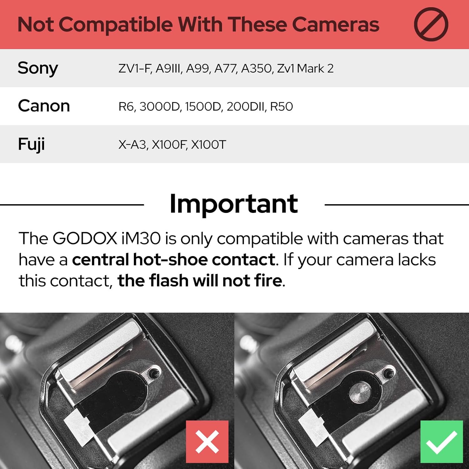 Compact Powerhouse for On-the-Go Photography The Godox iM30 Mini Flash is engineered for portability, reliability, and performance. Weighing only 78g (without batteries) and measuring just 2.4″ x 2.05″ x 1.77″, this ultra-compact unit slips easily into your pocket or camera bag while delivering a powerful GN15 output at ISO100. Ideal for casual shooters, travel vloggers, and street photographers seeking lightweight lighting options without compromising brightness or quality. Manual Flash Control with 7 Power Levels This flash operates in full manual mode with 7 adjustable power levels (1/64 to 1/1), allowing photographers to fine-tune their lighting to match any shooting condition. While it does not offer bounce or swivel head capabilities, its direct flash output is perfect for fill lighting and front illumination—especially when used with short or pancake lenses. Reliable Performance Powered by AAA Batteries The iM30 uses 2 AAA batteries (not included), supporting approximately 230 full-power flashes. Its recycle time ranges between 3 to 6 seconds depending on battery quality. With user-replaceable batteries, you’ll never be left waiting for a recharge—just swap and shoot. Universal Compatibility with Central Hot Shoe Cameras The Godox iM30 is compatible with a wide range of DSLR and mirrorless cameras from Canon, Nikon, Sony (ZV-E10, ZV-1, etc.), Fujifilm, Olympus, Panasonic, Pentax, and more. Featuring a single-contact hot shoe, the flash offers a plug-and-play setup for easy integration. Note: This flash is not compatible with models lacking a center hot shoe contact or listed on the incompatibility list (e.g., Sony ZV-1F, Canon R50, Fuji X100F, etc.). Smart Optical Trigger Functionality Built-in S1 and S2 optical slave modes allow the flash to sync with other manual flashes, extending its use in multi-light setups. Whether you’re augmenting ambient light or setting up an off-camera solution, the iM30 adapts effortlessly to your workflow. Color-Accurate Output with Natural Tones With a color temperature of 6500K ±200K, the Godox iM30 delivers natural daylight-balanced illumination, enhancing subject clarity and tonal accuracy in portraits, product shots, or candid street photography. Note: Please consult the compatibility chart before purchase. The flash is not TTL-enabled and must be used in manual flash mode. For best performance, avoid lenses longer than 3 inches in front element length, as they may cast shadows due to the flash’s fixed position.