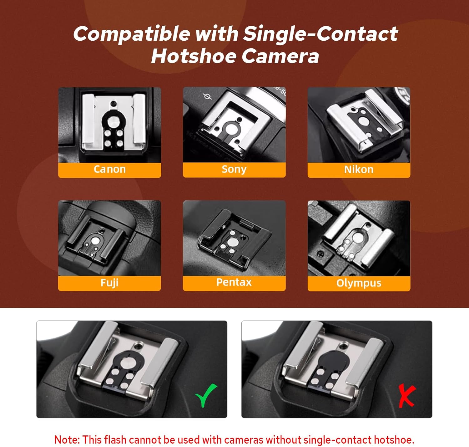 Warm Tips : This flash Doesn’t WORK with the following camera models: Sony A9III, A99, A77, A350, ZV-1F; Canon EOS Rebel SL3, 250D, T7, 1500D, 2000D, T100, 3000D, 4000D, 200DII, R7, R6II, R8, R10, R50; Fujifilm X-A3, X100F, X100T (NOT Compatible).