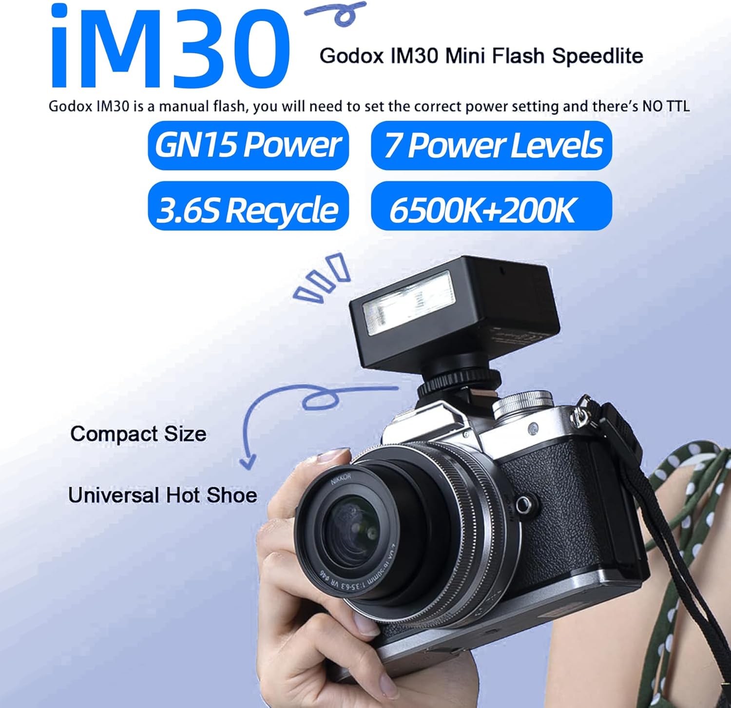 TIPS:Godox IM30 mini manual flash is NOT compatible with Sony ZV-1F, A9III, A99, A77, A350. NOT compatible with Canon EOS Rebel SL3, 250D, T7, 1500D, 2000D, T100, 3000D, 4000D, 200DII, R7, R6II, R8, R10, R50. NOT compatible with Fuji X-A3, X100F, X100T. Check the “Camera Compatibility List” in the product photos before purchase to ensure proper compatibility.