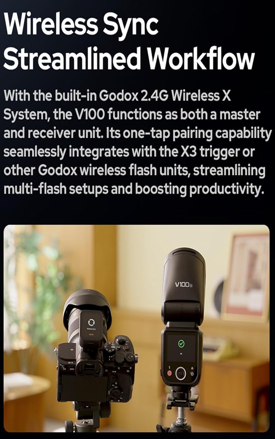 [Wireless Sync, Streamlined Workflow] With the built-in Godox 2.4G Wireless X System, the V100SU functions as both a master and receiver unit. Its one-tap pairing capability seamlessly integrates with the X3 trigger or other Godox wireless flash units, streamlining multi-flash setups and boosting productivity