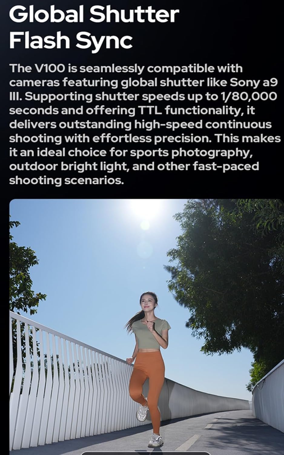 [Global Shutter Flash Sync] The V100SU is seamlessly compatible with cameras featuring global shutter like Sony a9 III. Supporting shutter speeds up to 1/80,000 seconds and offering TTL functionality, it delivers outstanding high-speed continuous shooting with effortless precision