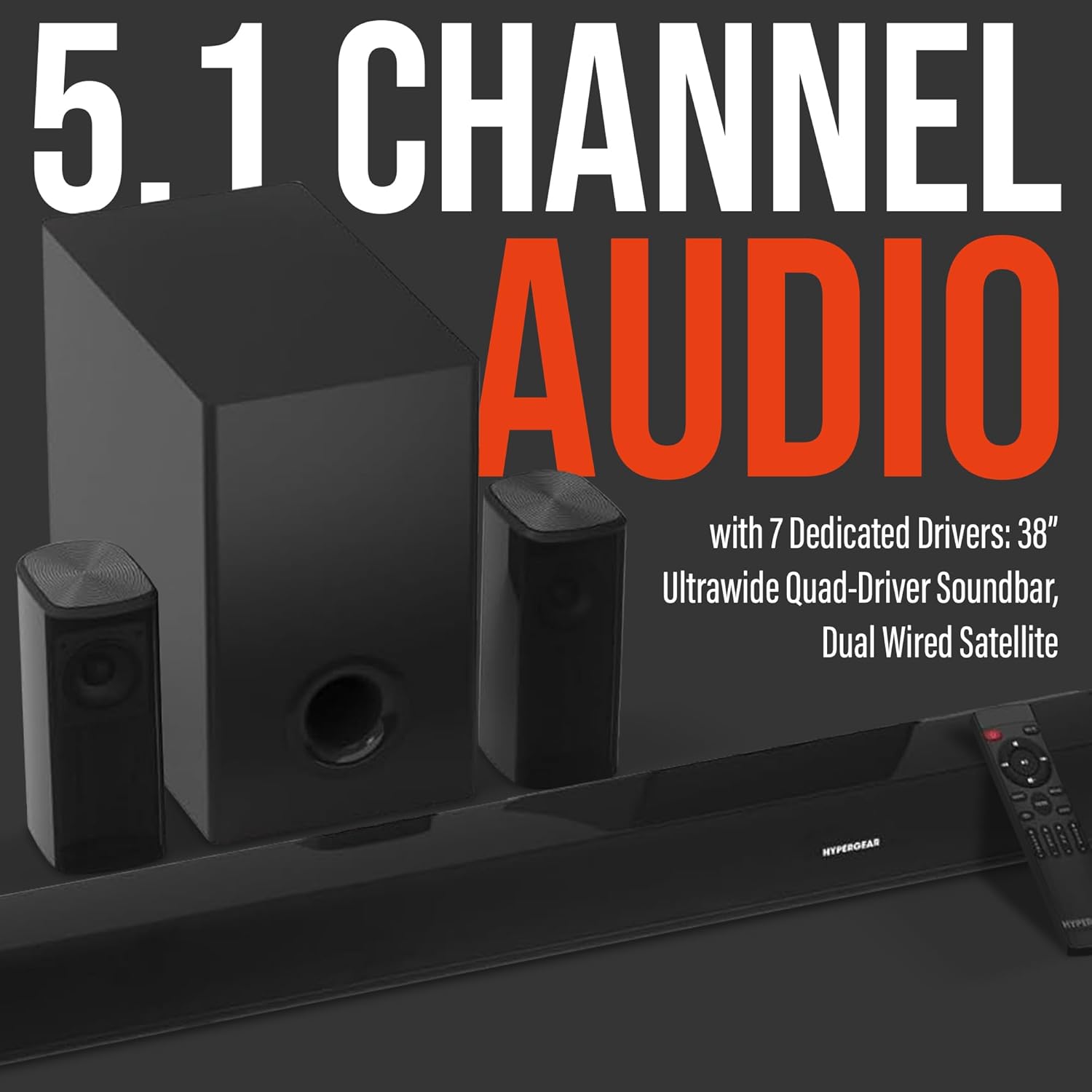EASY SETUP & INCLUSIONS: Quickly set up your wireless surround sound system for TV with the included wall-mounting hardware and full-function remote. The package includes a 38” ultrawide quad-driver soundbar, dual wired satellite speakers, 5.25” front-firing subwoofer, wall-mounting hardware, and a full-function remote for comprehensive audio coverage.”