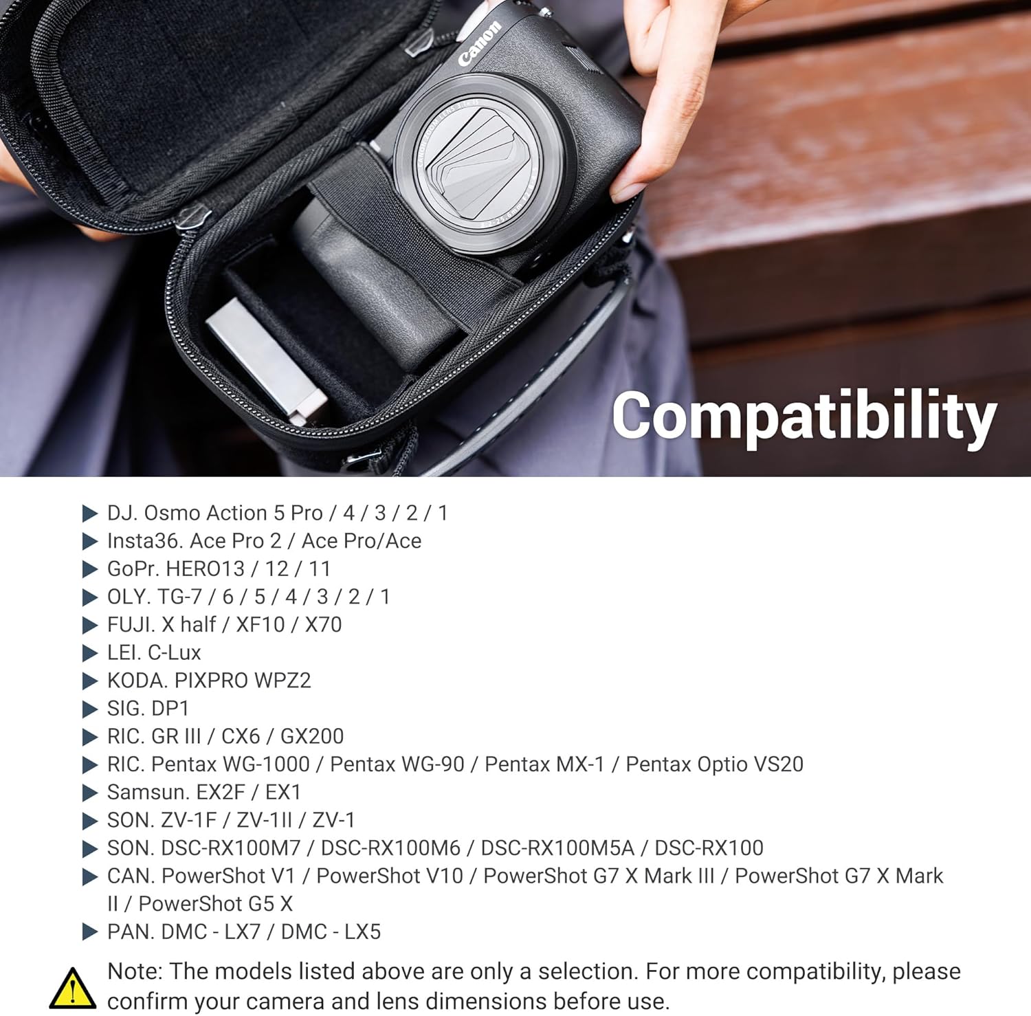 Compatible with Canon PowerShot V1, PowerShot V10, PowerShot G7 X Mark III, PowerShot G7 X Mark II, PowerShot G5 X, Sony ZV-1F, ZV-1 II, ZV-1, RX100 VII, DSC-RX100 VI, RX100 VA, RX100, Olympus TG-7, TG-6, TG-5, TG-4, TG-3, TG-2, TG-1, Ricoh GR III, GoPro Hero 13, Hero 12, Hero 11, Insta360 Ace Pro 2, Ace Pro, Ace, GO Ultra, DJI Osmo Action 5 Pro, Action 4, Action 3, Action 2 and more cameras