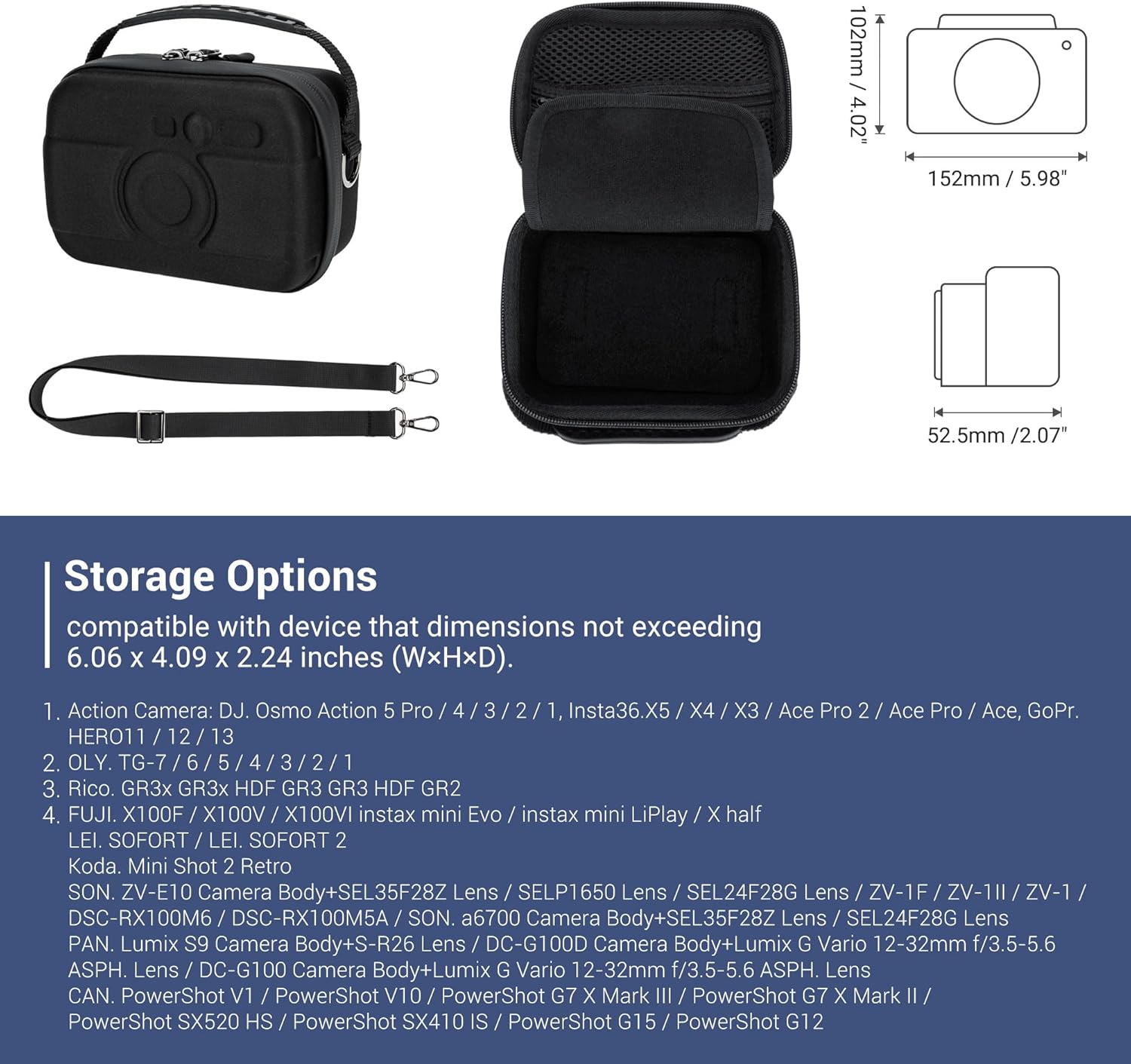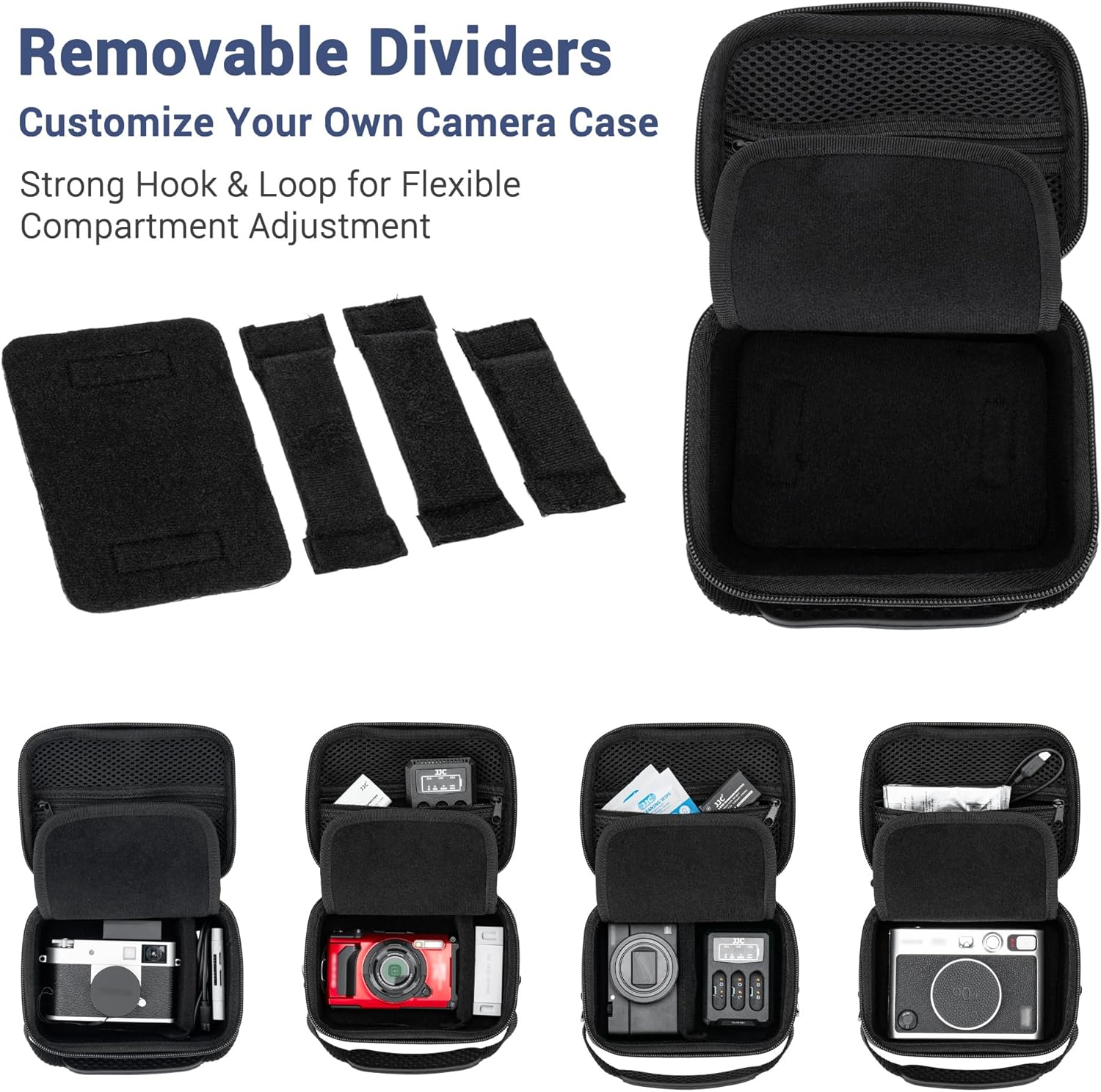 【Compatible with Film Camera series and More】:Included three removable dividers to flexibly organize space camera and the accessories, prevent collision with each other. Compatible with device that dimensions not exceeding 6.06 x4.09 x2.24 inches (WxHxD), includes Olympus TG-7 TG-6 TG-5 TG-4 Ricoh GR3 GR3X HDF Sony ZV-1 II ZV1 ZV-1F Fujifilm X Half Instax mini 41 mini EVO mini 99 Liplay and Film Camera includes Pentax 17 Kodak EKTAR H35N Half Canon AE-1 and More.