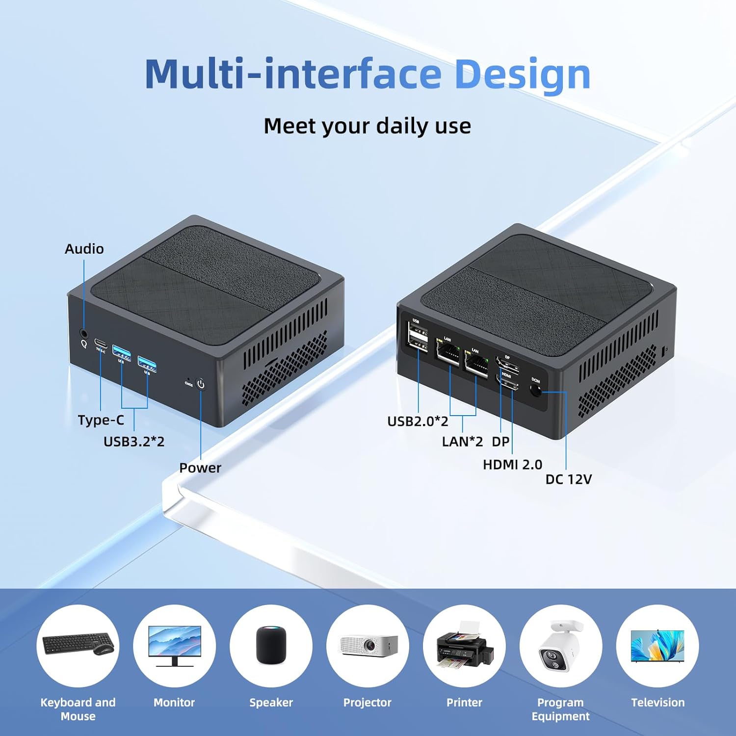 🌈【Dual High-Speed LAN Ports】For a superior networking experience, the TexHoo QN10-SE mini PC features dual Gigabit Ethernet ports, making it a superb choice for anyone needing a nimble office computer, a reliable soft router, or a robust home server. In terms of connectivity, it’s well-equipped with an array of ports: Front – Audio Jack*1, Type-C*1, USB3.2*2, Reset button*1, Power button*1; Rear – USB2.0*2, Gigabit Ethernet ports*2, HDMI (4k@60Hz)*2, DC Jack*1.