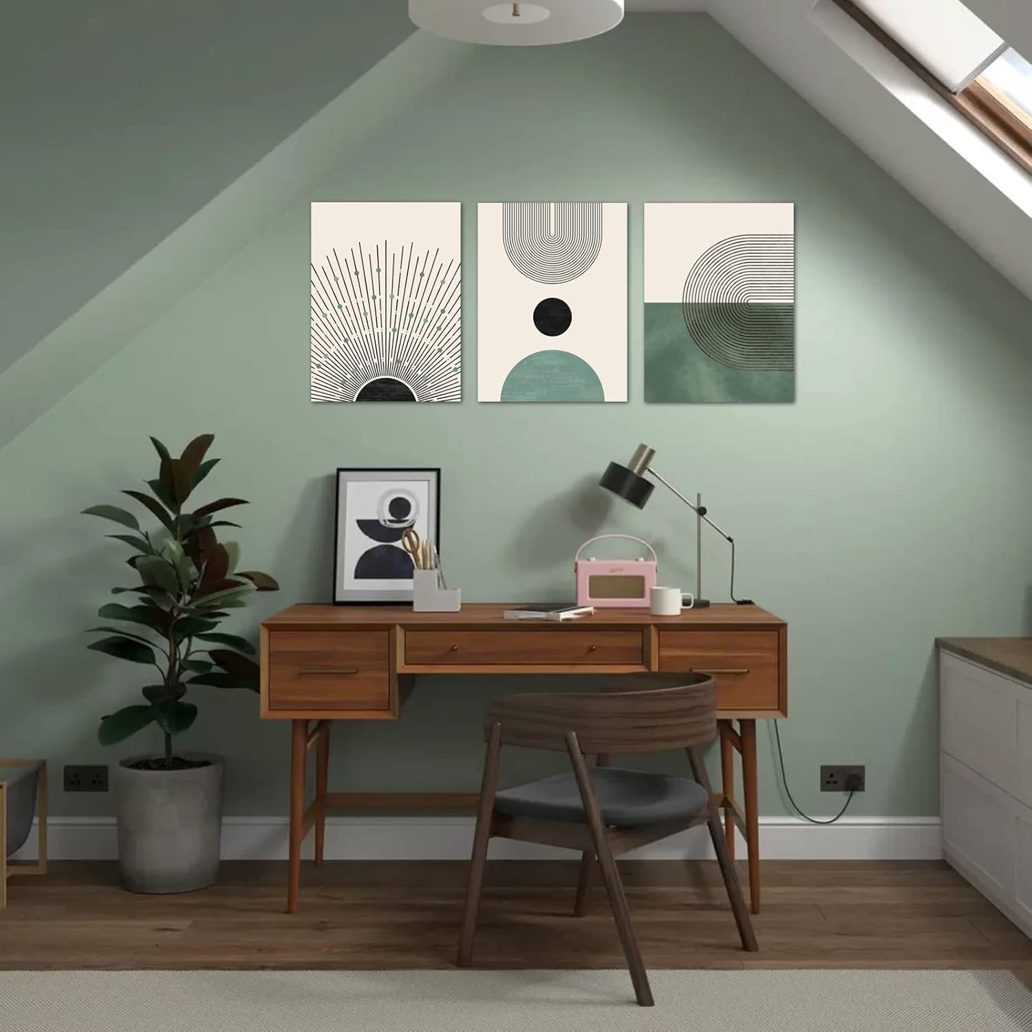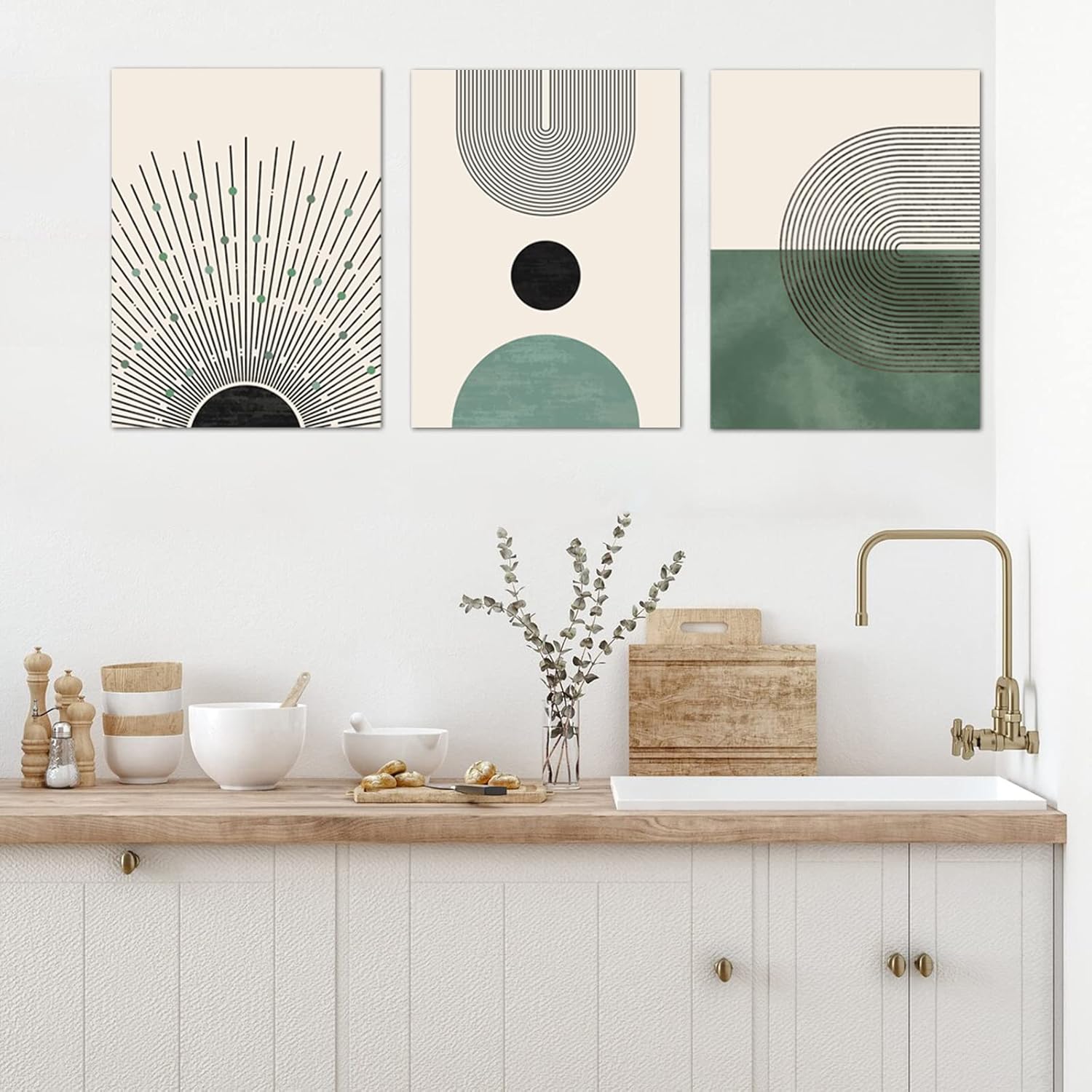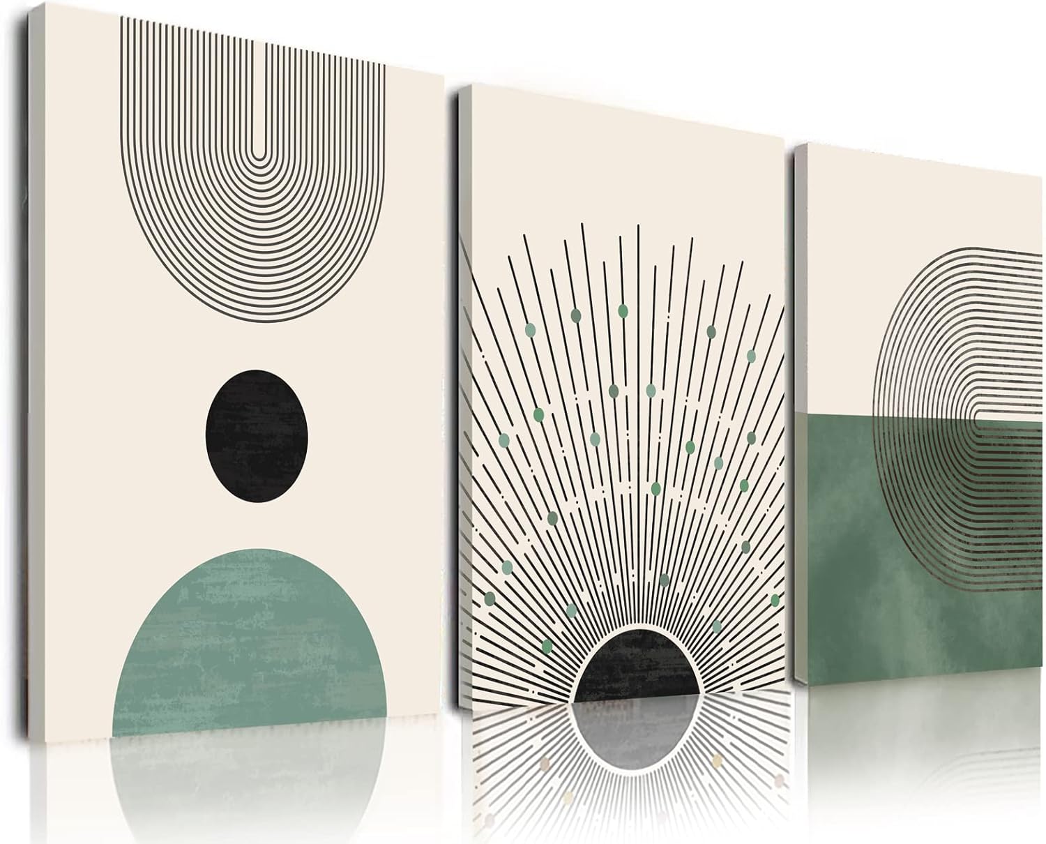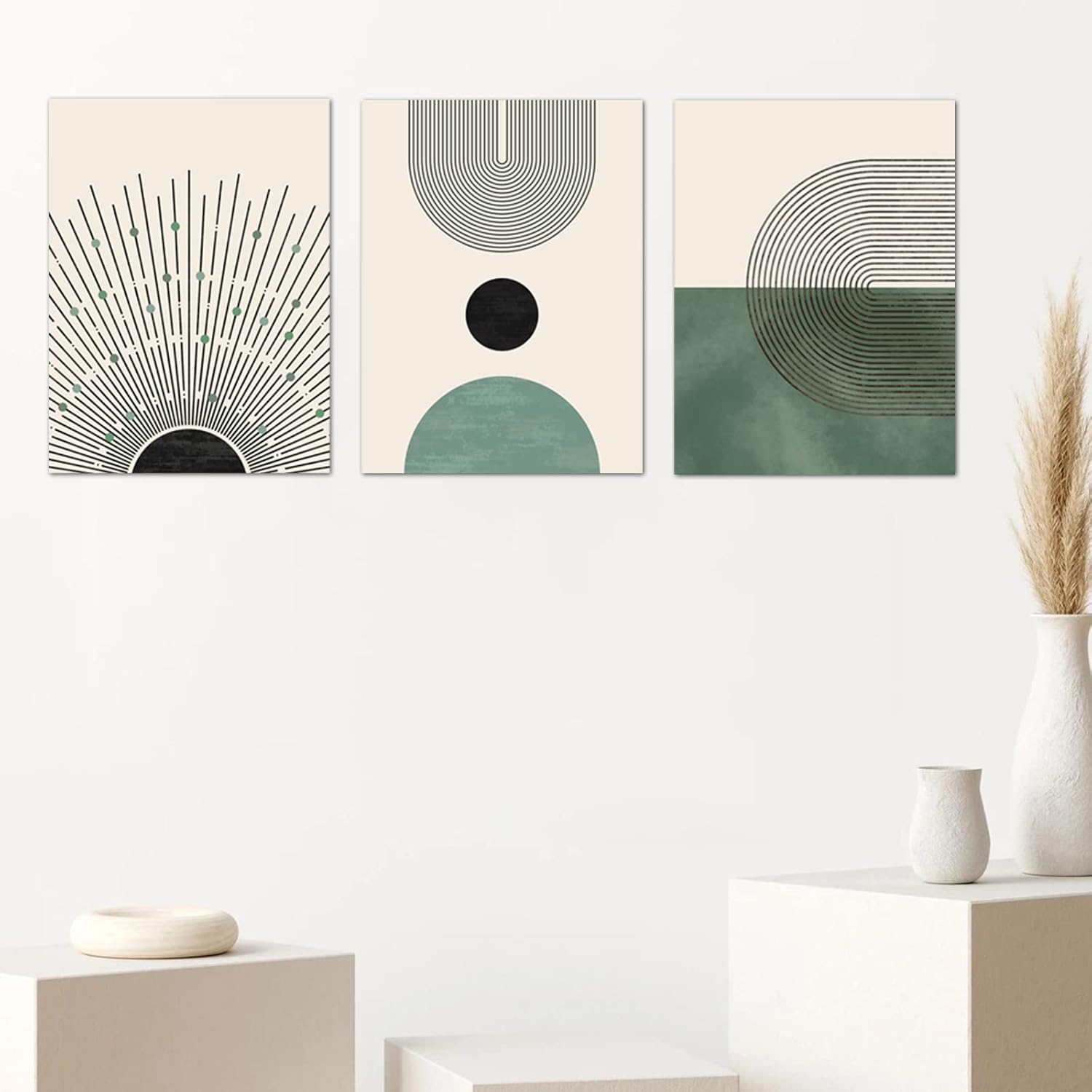 Sage Green Boho Wall Art Set of 3, Minimalist Framed Geometric Line Sun Green Canvas Artwork Paintings, Modern Boho Room Decor, Sage Green Abstract Wall Art for Living Room, Bedroom, Bathroom, Office