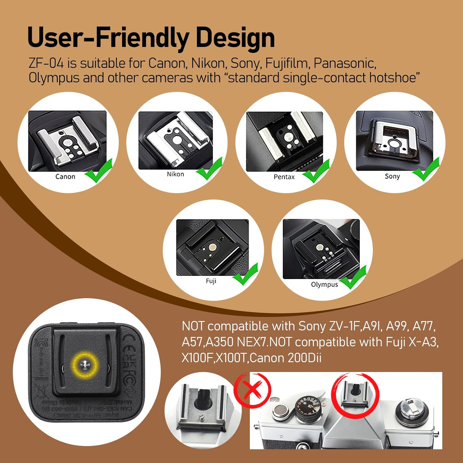 Universal Hot Shoe Interface: With a single-contact universal hot shoe mount, the ZF04 is compatible with most cameras on the market, including Fuji XT5, Canon R8, Nikon Z30, Sony ZV1, A7M4, A6700, and Leica Q3.