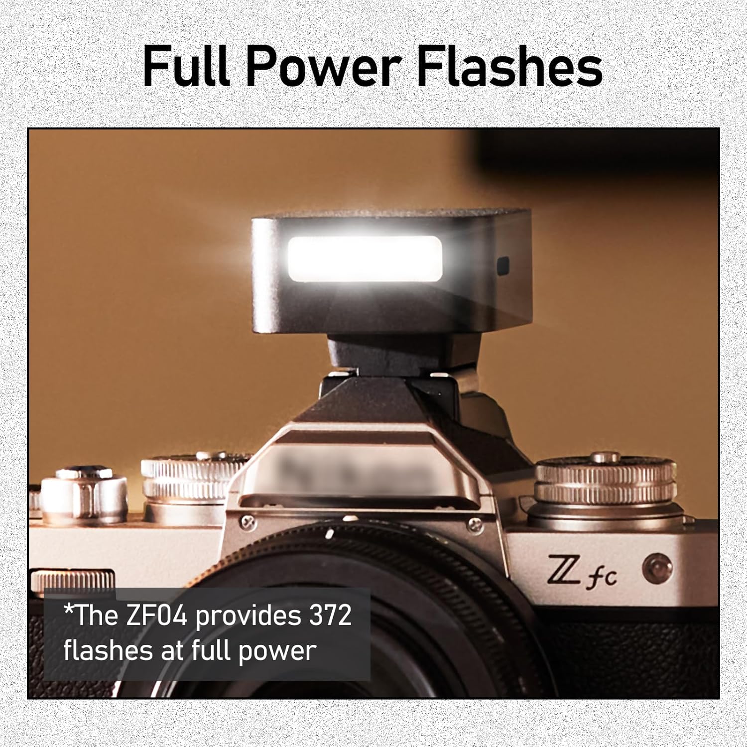 Adjustable Power Outputs: The ZF04 mini flash features two adjustable flash power settings: full power flash output 1/1, 1/2 output, allowing continuous shooting while maintaining a color temperature of approximately 6500K.
